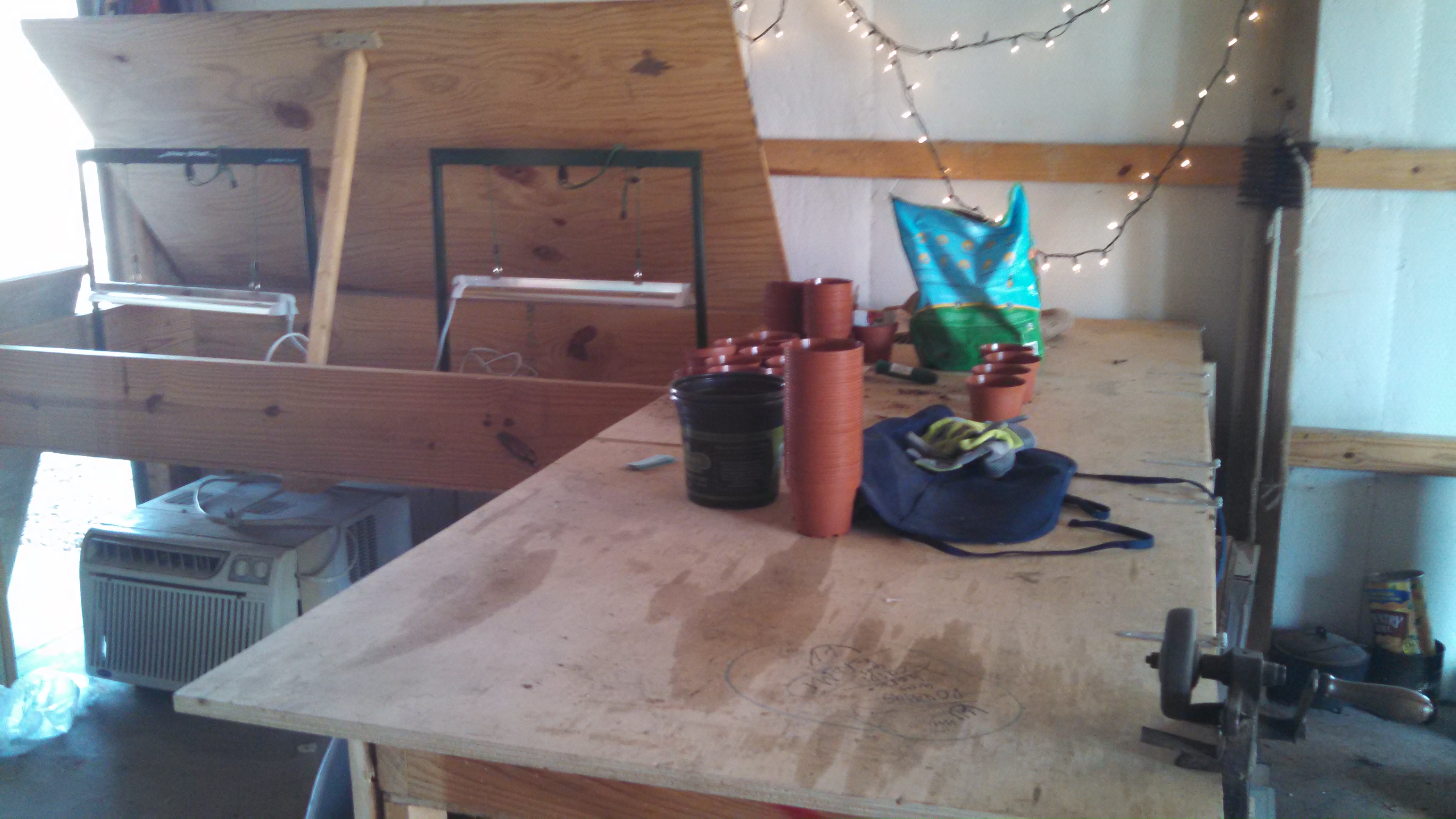 We are fortunate enough to have a large shop where I can start seeds early. Last year, CAT built me these great work tables. The tops open up for off season storage, or for setting up a green house effect.