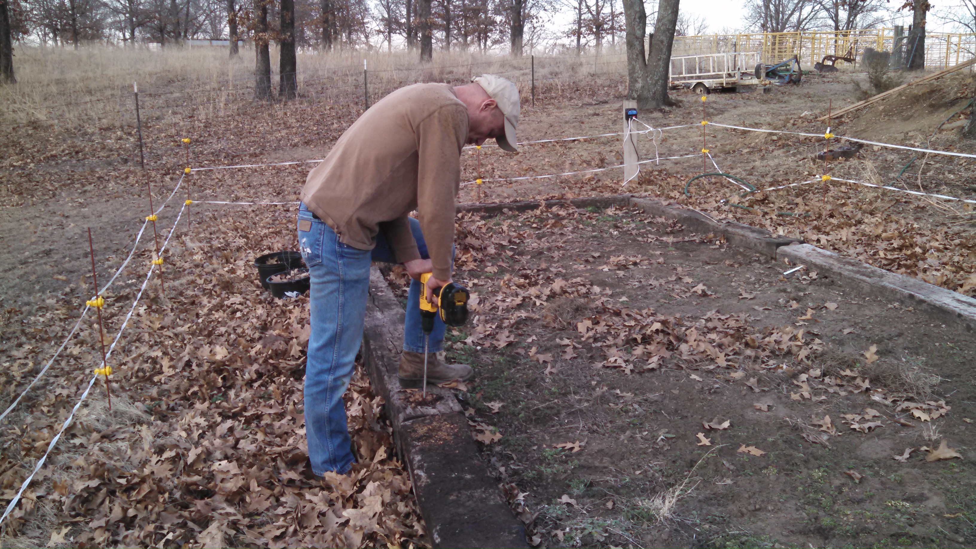 The first project was to stake down the wood from last year’s garden now that we’ve decided it works well where it is. This meant drilling holes through two levels of wood, cutting Rebar, and driving the stakes into the ground.
