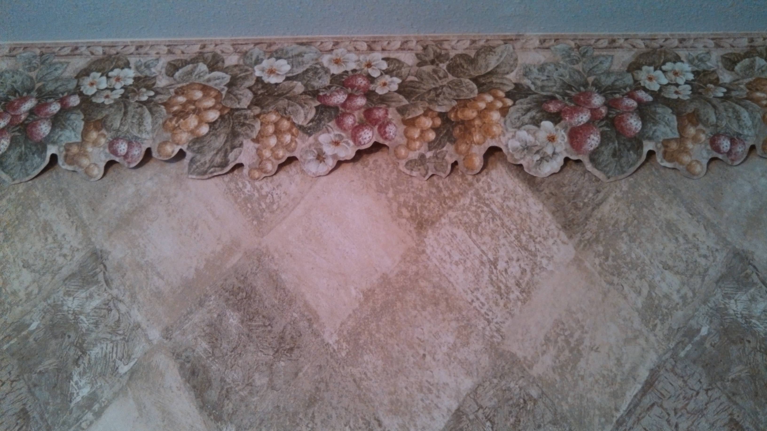 Anyone that knows us, understands that we are more into neutral tones–browns, mild greens, barely blues, and the like. I picked a lovely shade of white-blue called Wispy Cloud from Glidden (No, they didn’t pay me to tell you that), and commenced operation repaint bathroom, starting with the wallpaper border around the top of the walls. That was pretty easy and only took about 1.5 hours to take down.