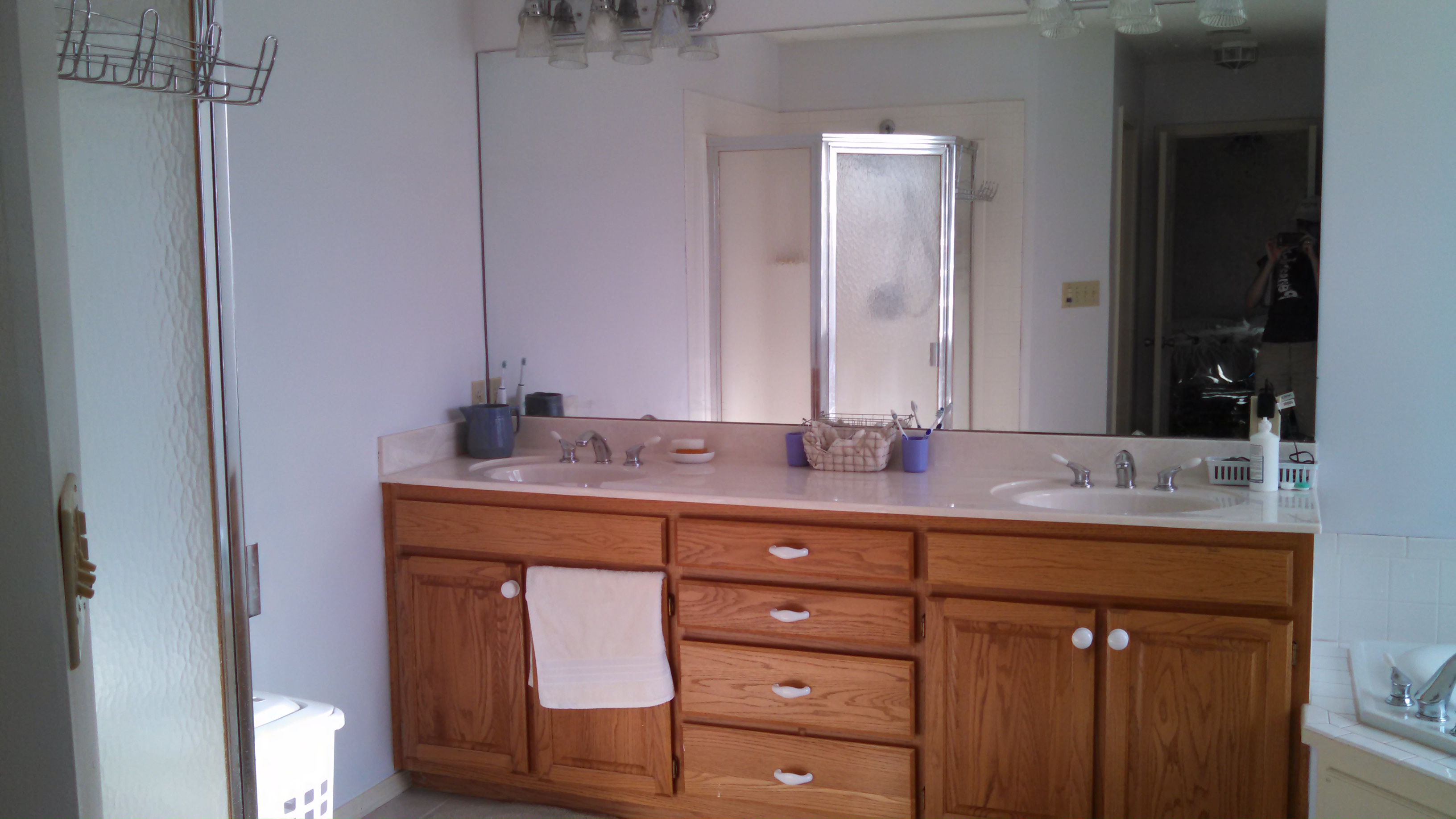 The room that really bugged me most was the purple master bathroom. Don’t get me wrong, I like purple. It’s my favorite color! The shade of purple used in the bathroom was actually one of my wedding colors. It had to go.